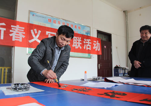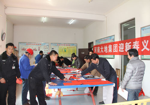 (本报讯)2月10日上午,农历甲午年腊月二十二,大地公司中控办公楼一楼烧成车间会议室内,翰墨飘香,欢声笑语,大地集团在这里隆重举行迎新春义写春联活动。 在传统乙未年农历新春佳节到来前夕,大地集团在妥善安排好职工年货的基础上,非常重视企业文化建设,邀请部分国家级和省级书法家协会会员到集团开展义写春联活动,活跃企业文化,营造新春气氛。此前,集团提前安排专人购买了笔墨纸砚和红纸,并结合企业发展现状,拟写了部分喜庆、新颖、励志、接地气的新春楹联内容,使职工在欢度新春佳节的同时,提振士气,爱岗敬业,立足岗位做贡献。