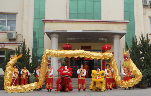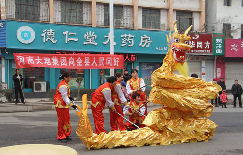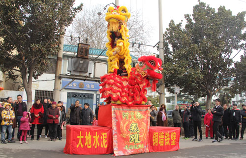 狮舞龙腾耀盛世,腾跃盘旋呈祥瑞。2月24日上午,宝丰县第二十四届民间艺术大赛如期举行,在县城人民路县公安局门前,由大地集团表演队——来自许昌市的飞跃武术龙狮团的龙飞狮舞成为大赛的亮点。 为了搞好此项活动,大地集团聘请许昌市飞跃武术龙狮团和许昌卷烟厂黄金叶盘鼓队前来表演,青龙翻腾越四海,瑞狮起舞闹八方,一条金色的巨龙在众人的娴熟操纵下上下翻飞腾腾而起,巨龙摇头摆尾变换着雄壮身姿,象征着大地集团热烈红火的发展前景,也宣示着宝丰大地的腾腾创业气息。双狮追逐嬉戏,你追我赶,惟妙惟肖,预示着生机勃勃的大地集团不断发生着新的变化,也预示着这片父城热土的巨大活力。盘鼓敲起来!阵阵高亢有力的宏音,似是催促着大地集团全体干部职工奔向新征程。精彩的表演吸引了大批观众,将演出现场围拢得水泄不通,一个个拿出手机不停地拍照录像……。 随后,龙狮团又来到大地集团慰问演出,演职人员在大地公司院内摆开龙门阵,大展身手。为广大干部职工献上了一场精彩的龙狮盛宴,赢来阵阵掌声。 最后,由双狮引路,巨龙表演进入大地公司中控楼,向大地集团拜年祈福、期盼狗年大吉!