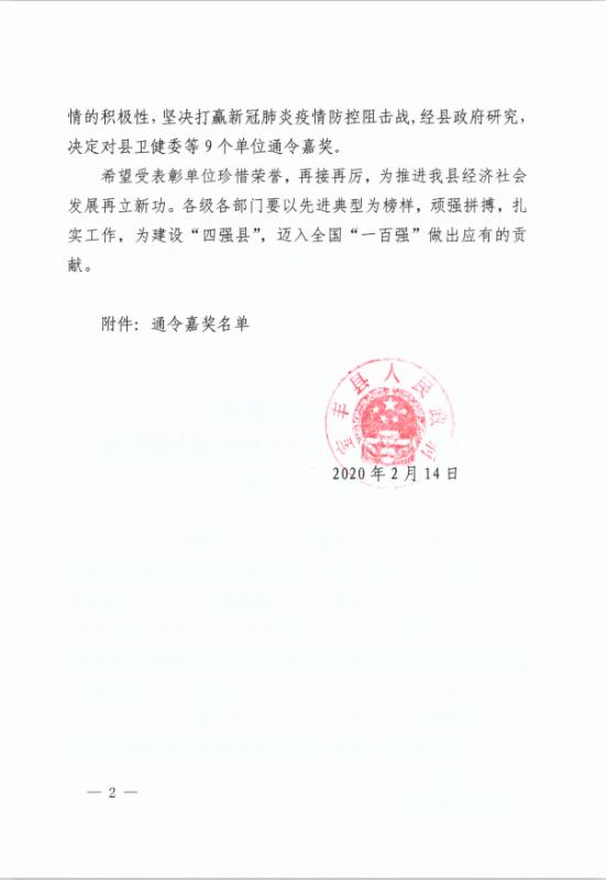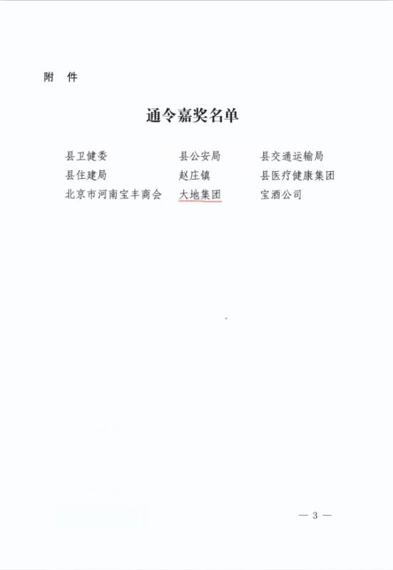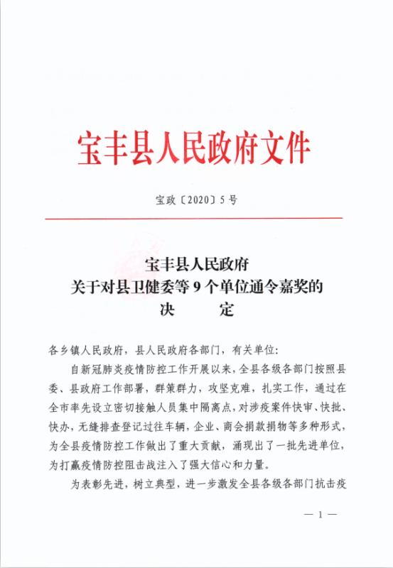 日前,县政府专门下发嘉奖令,对全县疫情防控工作中涌现出的先进单位予以表彰,万象城官方注册因工作成绩突出、贡献重大,受到县政府的通令嘉奖。 面对突如其来的新冠肺炎疫情,大地集团迅速行动,坚决把职工的身体健康和生命安全放在首位。在不折不扣地执行省、市、县新冠肺炎疫情防控命令的同时,结合自身实际,周密部署,狠抓落实。第一时间成立了新冠肺炎疫情联防联控工作领导小组,制定了详细的《疫情防控方案》和《疫情应急预案》。集团各部门、各公司认真落实各项防控措施,步调一致、严防坚守,疫情防控和复工复产工作均紧张有序地进行。 大地集团始终弘扬公益精神,积极承担社会责任。新冠肺炎疫情发生以来,大地集团高度关注,在做好自身防控工作的同时, 2月1日下午,集团向河南省慈善总会捐助现金1000万元人民币,用于平顶山市和宝丰县疫情防控工作,为打赢这次疫情防控攻坚战贡献一份力量。