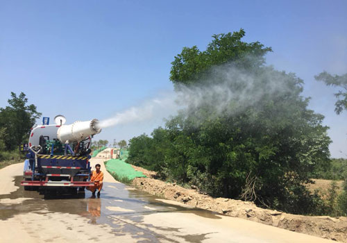 雾炮车对正在对矿山进行喷洒降尘