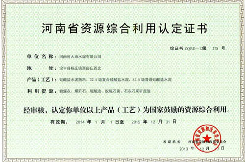 首页 >> 万象城(中国) >>资质荣誉 >> 河南省资源综合利用认定证书